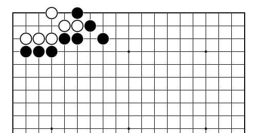 Thầy còn nhớ một tình huống khá vui về bài tập này. Hôm ấy là một trận tập huấn chuản bị giải cờ vây toàn quốc 2009 giữa bạn Tấn Phát 2 dan và bạn Chí Tâm 2 dan. Thắng thua quyết định ở thế cờ sống chết dưới đây và ai thắng được thưởng 20.000!. Đến lược Tâm đi quân đen nếu bắt chết đám trắng này thì thắng còn không bắt chết được thì thua. Hình này đến 90% dan player đều thuộc lòng, nhưng bạn Tâm có vẻ bối rối (do chưa luyện), cộng thêm các bạn bên ngoài “xôn xao” muốn xem Tâm có nuốt được 20.000 không? Kết cục là sau hơn nửa giờ mím chặt môi, đầy quyết tâm và tập trung, bạn Tâm đã không bắt được và thua ván cờ. Đau quá!