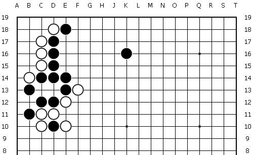 Trong ván đấu gần đây của thầy với Regular 5dan trên mạng KGS, do thầy lấy moyo quá bự nên anh ta đã phải bỏ cả môt biên và góc để phá cái bụng của thầy. Tuy nhiên để lấy được trọn cái góc này thì phải giải quyết được bài tập sống chết dưới đây:
