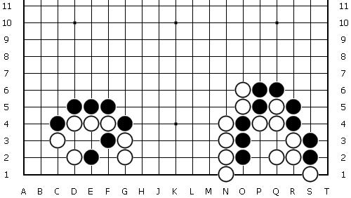 góc bên trái: d3: vồ ; trắng ăn d4: bắt hay atari, d3 tiếp: vồ ngược