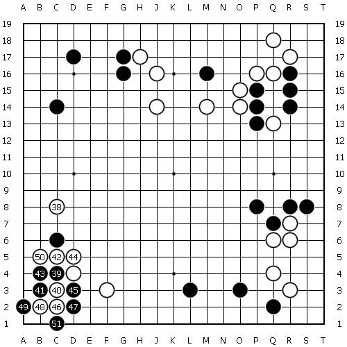 sau khi ổn định ở bên góc phải dưới, Trắng 38 sente triển khai biên trái dưới là rất quan trọng nhưng đến đây đen vẫn ưu thế vì những nước “vô nghĩa” lấy đất của Trắng ở J16 và J14. Đen 39 đến Đen 51 là định thức giải quyết trong tình huống này.Lý do đen “bỏ” quân đen C6 là do tiềm năng phát triển đất của trắng ở biên trái là co hạn chế vì quân Đen C14 rất sáng.