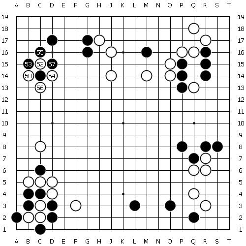 Từ Đen 55 đến trắng 58 là hợp lý. Đây là biến rất quan trọng với trận đấu này dù lúc này Đen có thể không Ko ngay ở A vì thiếu “Factory Ko”. Đen cần phải chơi rất cẩn thận trong việc sử dụng hình Ko này trong trận đấu. Nếu trắng thắng Ko ở C15 thì hình cờ trắng rất mạnh.