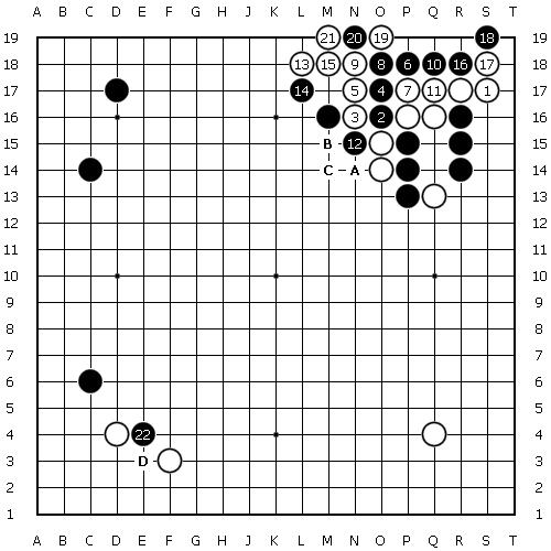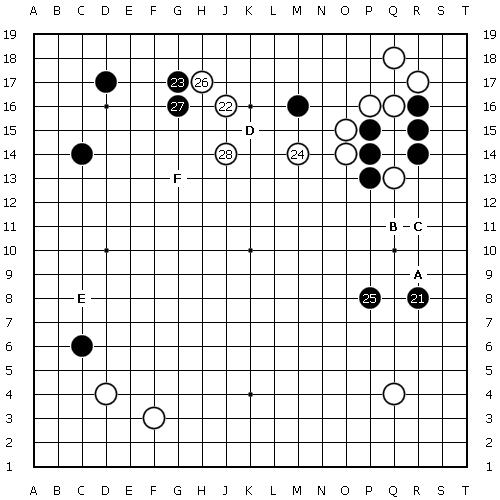 Đen 21 phát triển đất “hơi bị xa”, thường nước này được chơi ở A. Kiểu gì thì Đen cũng phải đi thêm một nước “gia cố” vì tồn tại những điểm aji B hoặc C, vì thế Đen quyết định đặt xa hơn một chút. Tiếp theo, trắng 22 đáp lại Đen 21 cũng là một nước phát triển lớn. Trắng 24 là một nước đi rất chắc nhằm tấn công quân đen M16 đồng thời chuẩn bị “tiếp sức” kế hoạch xâm nhập vào biên phải của đen. Lúc này tôi chọn một lối chơi cẩn thận, chắc chắn trong khi Đen chọn những nước phát triển nhanh.