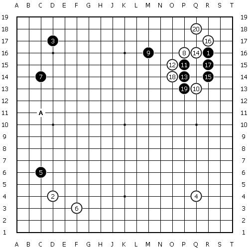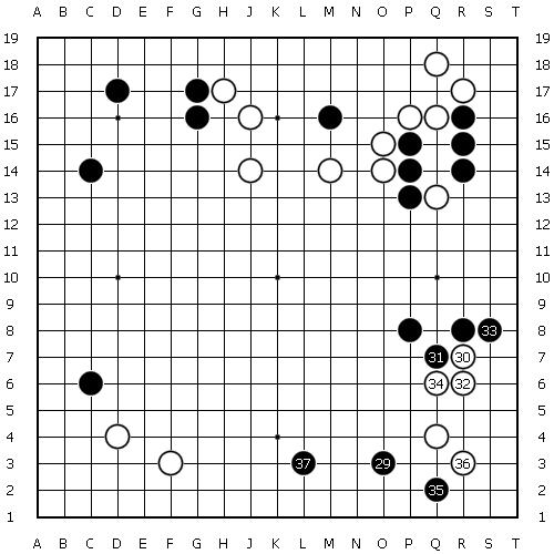Bình thường thì Đen 29 tấn công góc phải trắng là nước tốt, đó là định thức. Nhưng trong tình huống cụ thể trên bàn cờ thì nước này lại sai. Vì trắng không tấn công quân đen ở C8 nên đen nên chơi ở B4 trắng C3 rồi đen D9 phát triển moyo của đen bên biên trái rất hoàn hảo. Liên quan đến góc phải dưới thì cũng rất khó cho trắng để lấy đất vì đen luôn có thể chơi ở S4 nếu trắng đi lấy đất ở O3. Vì thế biên trái là “gấp” hơn biên phải.